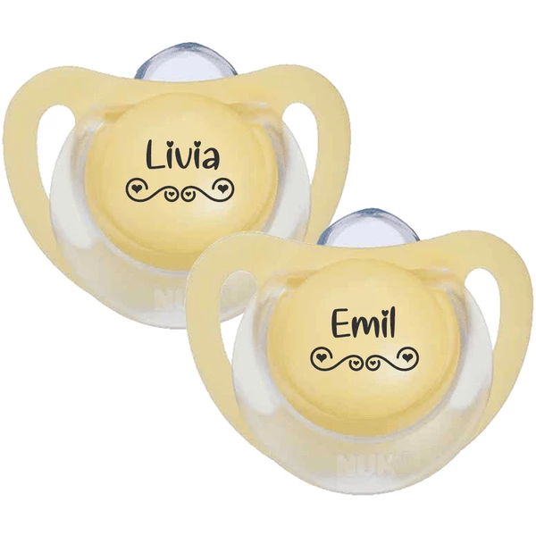 - Du erhältst zwei NUK Genius Schnuller mit anatomischen Saugteil aus Silikon mit deinem Wunschnamen graviert.