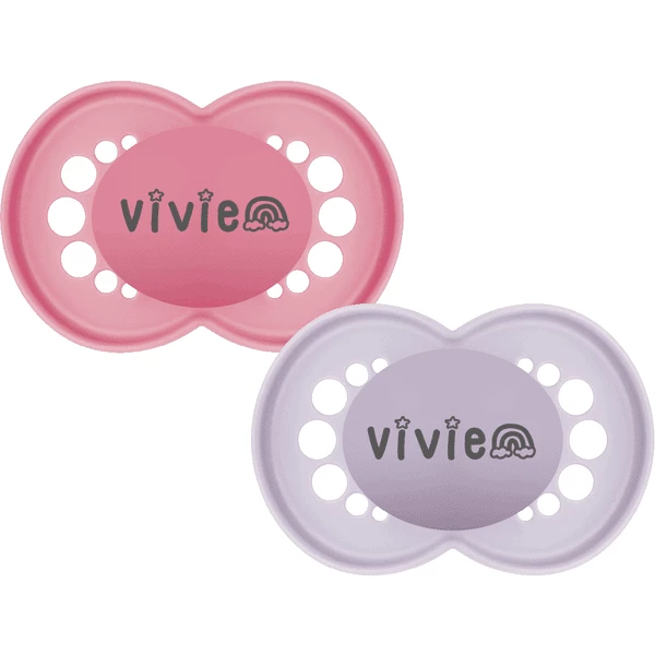 MAM Pure Schnuller mit Namen (Mädchen) in unserer süßen Regenbogenschrift im 2er Set. Du bekommst 2 original MAM Schnuller, die mit dem gleichen Namen und Motiv personalisiert sind. Du kannst Namen bis zu 10 Zeichen eingeben. Anatomisches, weiches Saugteil MAM SkinSoft™-Silikon Symmetrische Form von Saugteil und Schnullerschild, so dass der Schnuller immer richtig herum im Mund ist. Große Belüftungslöcher und abgerundete Schildräder verhindern Hautreizungen & Abdrücke. Frei von Bisphenol A (BPA), PVC und Phthalaten. Unsere Lasergravur wurde von einem unabhängigen Prüfinstitut auf PAK überprüft (Polyzyklische Aromatische Kohlenwasserstoffe) und als unbedenklich eingestuft. Im 2er-Set: 1 x Flieder, 1 x Rosa Informationen zur Gravur auf dem Namensschnuller: Chemiefreie Lasergravur des Namens Hitzebeständige, abriebfeste und damit langlebige Namensgravur. Die Farbe des Namens kann von anthrazit grau bis schwarz variieren. Wir gravieren den Namen direkt vor Ort – Qualitätsarbeit aus Deutschland! Wir gravieren auf beide Schnuller den gleichen Namen. Hinweis: Das Widerrufsrecht besteht nicht bei Fernabsatzverträgen zur Lieferung von Waren, die nach Kundenspezifikationen angefertigt werden oder eindeutig auf die persönlichen Bedürfnisse zugeschnitten sind, wie z.B. Schnuller mit Namen graviert. Hinweis zu unserer Regenbogen-Schrift: Bei einem kleinen i wird der Punkt durch einen Stern, ein kleines n durch einen Regenbogen ersetzt, sofern die Lesbarkeit des Namens dadurch nicht gefährdet ist. Im Zweifelsfall schreiben wir den Namen mit einem normalen n.