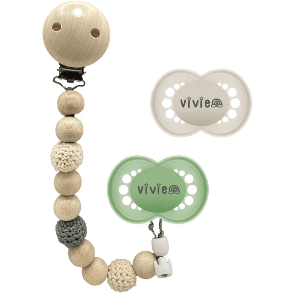 Süßes Geschenkset zur Geburt: MAM Pure Schnuller mit Namen in unserer süßen Regenbogen-Schrift im 2er Set. Du bekommst 2 original MAM Pure Schnuller, die mit dem gleichen Namen und Motiv personalisiert sind + 1 x Schnullireich Schnullerkette aus Naturholz und handgehäkelten Perlen. Du kannst Namen mit bis zu 10 Buchstaben eingeben. Anatomisches, weiches Saugteil MAM SkinSoft™-Silikon Symmetrische Form von Saugteil und Schnullerschild, so dass der Schnuller immer richtig herum im Mund ist. Große Belüftungslöcher und abgerundete Schildräder verhindern Hautreizungen & Abdrücke. Frei von Bisphenol A (BPA), PVC und Phthalaten. Unsere Lasergravur wurde von einem unabhängigen Prüfinstitut auf PAK überprüft (Polyzyklische Aromatische Kohlenwasserstoffe) und als unbedenklich eingestuft. Informationen zur Gravur auf dem Namensschnuller: Chemiefreie Lasergravur des Namens Hitzebeständige, abriebfeste und damit langlebige Namensgravur. Die Farbe des Namens kann von anthrazit grau bis schwarz variieren. Wir gravieren den Namen direkt vor Ort – Qualitätsarbeit aus Deutschland! Schnullireich Schnullerkette Häkelperle: 1 x Schnullerkette Häkelperle – Passt dank unseres speziell entwickelten Schnullerhalters perfekt für diese MAM Schnuller ohne Ring. Hinweis: Das Widerrufsrecht besteht nicht bei Fernabsatzverträgen zur Lieferung von Waren, die nach Kundenspezifikationen angefertigt werden oder eindeutig auf die persönlichen Bedürfnisse zugeschnitten sind. Warnung! Zur Sicherheit Ihres Kindes: Die Schnullerkette orientiert sich an der europäischen Sicherheitsnorm EN 12586. Daher ist die Länge der Kette (ohne Clip) auf max. 22 cm begrenzt. Befestigen Sie die Kette immer direkt an der Kleidung und verlängern Sie die Kette nicht durch Bänder, Gurte, lose Teile der Kleidung (Strangulationsgefahr!). Bitte überprüfen Sie die Kette vor jedem Gebrauch auf Mängel, Verschleiß oder Beschädigungen. In dem Fall bitte sofort wegwerfen! Verwenden Sie die Kette nicht im Laufstall, Bett, Wiege oder Kinderwagen oder während des Schlafens. Die Kette ist kein Spielzeug, sondern dient nur zur Befestigung eines Schnullers Bei normalen Verschleiß kann sich der Knoten der Kette öffnen. Es können dann Kleinteile verschluckt werden. Die Kette deshalb nur unter Aufsicht verwenden! Überprüfen Sie bitte regelmäßig, ob die Enden der Kette tatsächlich gut fixiert sind. Jede Kette ist eine Sonderanfertigung. Wie jedes andere Holzspielzeug kann es auch hier zum Farbabrieb kommen. Die verwendeten Holzfarben sind speichelfest, schadstoffrei und entsprechen den Bedingungen der DIN-EN 71-3 und 12586. Pflegehinweis: Bewahren Sie die Schnullerkette trocken auf. Reinigen Sie die Kette nur mit einem feuchten Tuch, niemals mit scharfen Reinigungsmitteln oder Desinfektionsmitteln. Bitte nicht auskochen!