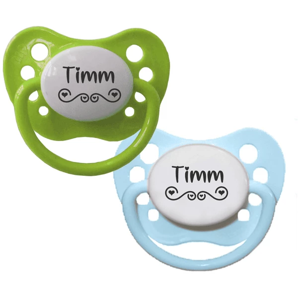 - Du erhältst zwei Schnuller von NIP mit Silikonsauger mit deinem Wunschnamen und Wunschmotiv graviert.