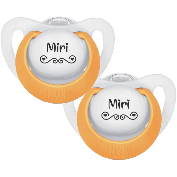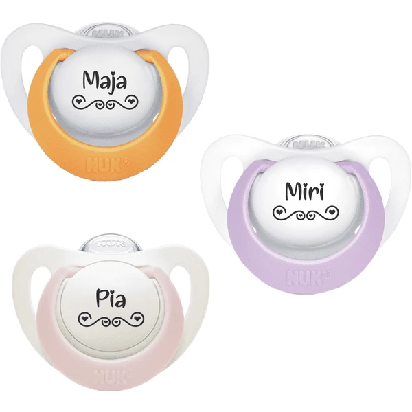 - Du erhältst zwei NUK Genius Schnuller mit anatomischen Saugteil aus Silikon mit deinem Wunschnamen graviert.