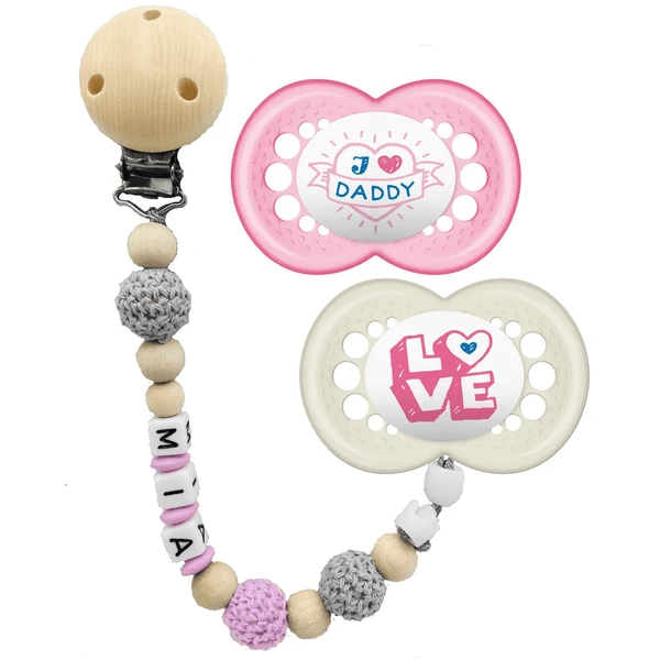 - Du bekommst 2 x original MAM Schnuller – I Love Daddy – im 2er Set Mädchen mit wunderschöner Schnullireich Schnullerkette mit Namen aus Naturholz und handgehäkelten Perlen