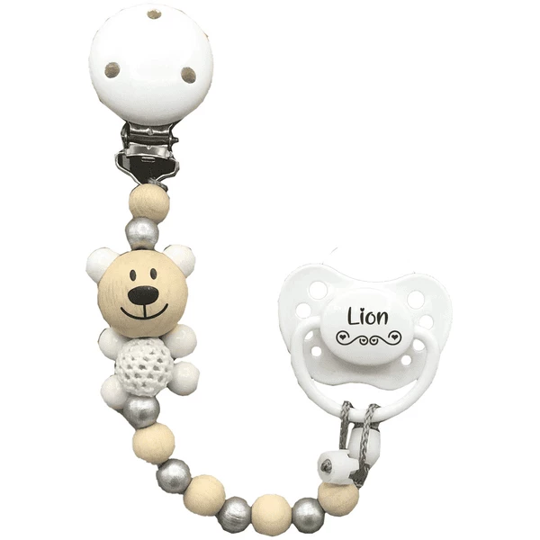Schnullireich Schnullerkette ohne Namen Häkelbär Natur Silber